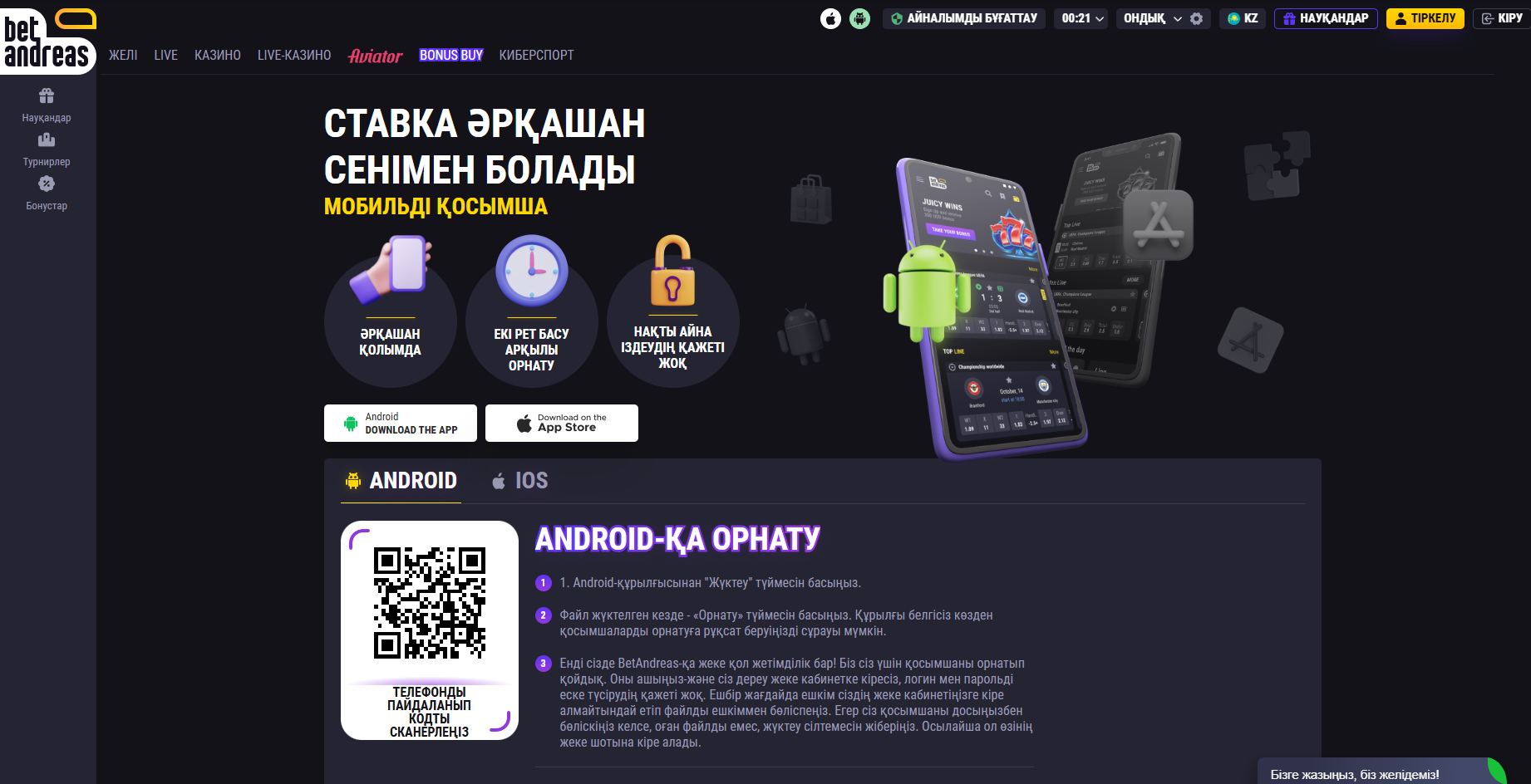 Тек ресми Betandreas айнасын және тексерілген Betandreas apk download файлдарын пайдалану ұсынылады. Betandreas промокодын белсендіріп, максималды бонустар алыңыз және ойынды артықшылықпен бастаңыз.